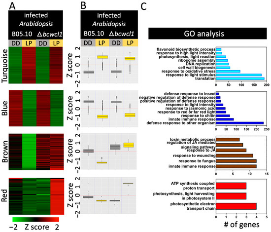 Finally, using the pathogen:host RNA-seq strategy depicted in Figure 1, we also determined the major light-dependent transcriptional changes occurring in A. thaliana when infected with B. cinerea. Regardless of the fungal genotype, 8905 genes were considered differentially expressed upon light stimulation (Table S8), with 61.6% of them differentially expressed upon challenge with B05.10 and ∆bcwcl1 (Figure S5). The weighted correlation network analysis (WGCNA) revealed four major clusters of coregulated genes (Figure 6, Table S9). Irrespective of the fungal strain with which Arabidopsis was infected, the turquoise and blue clusters displayed LIG and LRG. The first cluster contained GO terms related to LP, such as photosynthesis, oxidative response, and flavonoid biosynthesis. The blue cluster of LRGs also contained a group of transcripts associated with light terms, including “response to red or far-red light”. Interestingly, and consistent with the major findings depicted in Figure 5 (see above), different GO terms related to plant defense responses were enriched among those genes repressed upon the LP, including “response to chitin” an abundant polysaccharide that provides strength to the cell walls of fungi. In agreement with these observations, the brown cluster of Figure 6 also displayed GO terms that include several defense-related entries, such as the defense response to fungi, the regulation of jasmonic acid, and the “response to jasmonic acid,” an important phytohormone that orchestrates plant defense responses to necrotrophs. In the red cluster, only energy and photosynthesis-related GO terms were identified among DEGs. This particular group of Arabidopsis genes was highly induced upon light stimulation, but only during the infection with the ∆bcwcl1 mutant. Two other clusters of coregulated genes were identified (Figure S7; Table S9), but no enriched GO terms were determined.