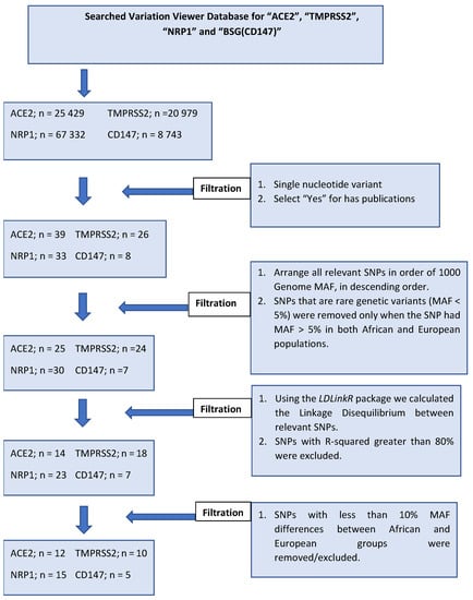 Adimulam, T.; Arumugam, T.; Gokul, A.; Ramsuran, V. Genetic Variants within SARS-CoV-2 Human Receptor Genes May Contribute to Variable Disease Outcomes in Different Ethnicities. Int. J. Mol. Sci. 2023, 24, 8711. https://doi.org/10.3390/ijms24108711