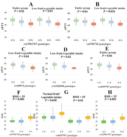 Associations of SERBP1 genotypes with activated partial thromboplastin time and body mass index. (A)—APTT values for rs12561767 in the entire group (p = 0.02) and in the group of patients with low fruit/vegetable intake (p = 0.01); (B)—APTT values for rs6702742 in the entire group (p = 0.04) and in the group of patients with low fruit/vegetable intake (p = 0.036); (C)—APTT values for rs105874 in the group of patients with low fruit/vegetable intake (p = 0.04); (D)—APTT values for rs12566098 in the group of patients with low fruit/vegetable intake (p = 0.02); (E)—APTT values for rs4655707 in the entire group (p = 0.04); (F)—BMI values for rs6702742 in the group of patients with BMI < 25 (p = 0.006); (G)—BMI values for rs4655707 in the group of patients with normal fruit/vegetable intake (p = 0.038) and in the group of patients with BMI < 25 (p = 0.01); (H)—BMI values for rs12561767 in the group of patients with BMI < 25 (p = 0.0023).