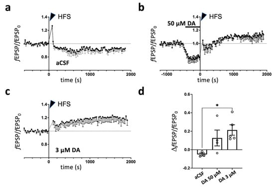 Because previous studies showed that dopamine (DA) has a permissive role in LTP induction in mPFC slices of young animals [,], we evaluated whether the same also happened in adult rats, testing the effect on LTP of two different protocols of DA application to mPFC slices from unstressed control animals, compared to aCSF (Figure 2). Firstly, DA 50 μM was transiently added to aCSF for 10 min before HFS, using a protocol previously shown to facilitate LTP in the PFC of animals exposed to acute mild stress []. We found that DA 50 μM application induced a mild facilitation of LTP (Figure 2b), which did not reach significance compared to aCSF (Figure 2b). We then adopted a second protocol in which aCSF was supplemented with 3 μM DA starting at least 30 min before HFS, in the presence of picrotoxin (1 μM) to partially block GABAa receptor transmission [] (Figure 2c). Using 3 μM DA yielded a significant LTP increase compared to aCSF (ΔfEPSP/fEPSP0, aCSF: −5.1 ± 1.6%; 50 μM DA: 12.7 ± 8.6%; 3 μM DA: 21.3 ± 5.6%; Kruskal–Wallis test p = 0.0159; Dunn’s multiple-comparisons test: 3 μM DA vs. aCSF, p = 0.0273) (Figure 2d).