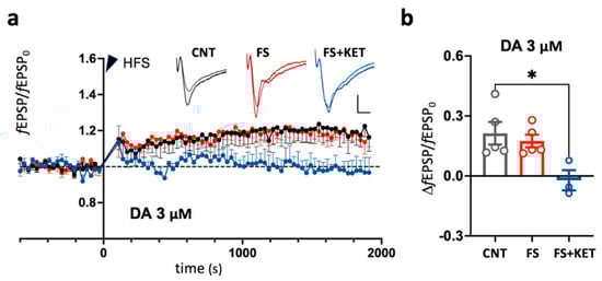 We thus selected the 3 μM DA protocol and studied the effect of FS and ketamine after FS on LTP induction in PFC slices in the presence of 3 μM DA. In this condition, HFS induced an easily detectable long-term change in fEPSP peak, FS did not significantly change LTP, and ketamine after FS slightly inhibited LTP (Figure 3a,b; ΔfEPSP/fEPSP0, CTR: 21.3 ± 5.6%; FS: 17.5 ± 3.2%; FS+KET: −2.1 ± 5.0%; Kruskal–Wallis test p = 0.0269; Dunn’s multiple-comparisons test: FS+KET vs. CNT, p = 0.050).