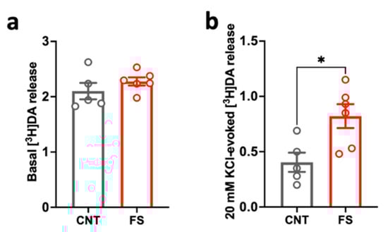 Having confirmed that DA is required for the induction of LTP in the PFC of young-adult rats, we asked whether acute FS may alter DA release in the PFC, because previous evidence showed that stress increases DA release and transmission in mesolimbic dopaminergic pathways []. Here, we measured basal and depolarization-evoked dopamine release from isolated presynaptic terminals (synaptosomes) in superfusion of rats subjected to FS stress and sacrificed 6 h after the stress session (the same time selected in previous experiments for ketamine injection), compared to controls. We found no significant changes in basal DA release despite a trend of increase in stressed animals (Figure 4a), while depolarization-evoked DA release was remarkably increased in the PFC of FS-stressed rats compared to controls (Figure 4b; unpaired t-test p < 0.05). Unfortunately, due to the complexity of these experiments and to the limited number of animals available for experimentation, it was not possible to measure whether the increase in DA release was sustained up to 24 h after FS stress exposure or to verify whether ketamine injection was able to modulate the effects of stress. Nevertheless, albeit preliminary, these results show that one session of FS triggers a long-lasting activation of dopaminergic transmission within PFC.
