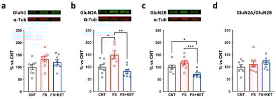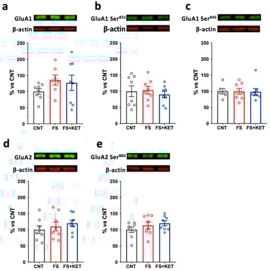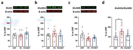 Moreover, although the levels of GluN2A and GluN2B were not altered (Figure 7b,c), the GluN2B/GluN2A ratio was significantly increased in animals subjected to FS compared to controls (Figure 7d; one-way ANOVA F(2,19) = 4.553, p = 0.0242; Tukey’s post hoc test: CNT vs. FS, p = 0.0268); the treatment with ketamine partly reversed this change (FS+KET vs. CNT, p = 0.8210). Regarding AMPA receptors, we found no significant changes in either GluA1 or GluA2 total expression or phosphorylation (Figure 8).