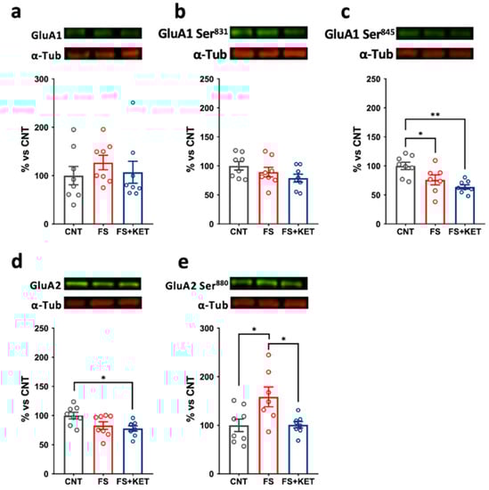 Protein expression levels and phosphorylation of AMPA receptor subunits in PFC total homogenate. (a) Total GluA1, (b) GluA1 phospho-Ser831, (c) GluA1 phospho-Ser845, (d) total GluA2, and (e) GluA2 phospho-Ser880 protein expression levels in PFC total homogenate from CNT, FS, and FS + KET rats. Data are expressed as percentage of controls and shown as means ± SEM. N = 8; Tukey’s post hoc test, * p < 0.05, ** p < 0.01.