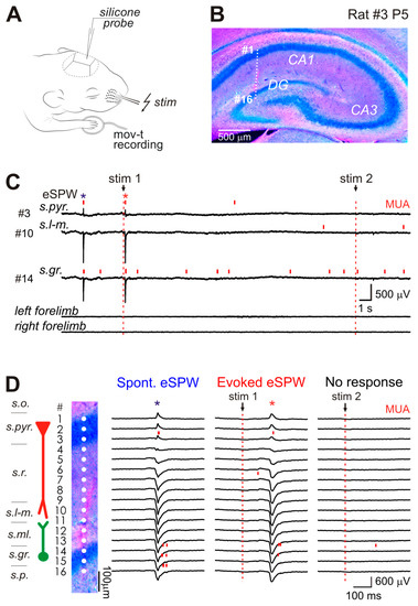 Early sharp waves (eSPWs) are the earliest organized activity pattern in the developing hippocampus of neonatal rodents [1,2,3,4,5,6]. Electrophysiological traits of eSPWs are similar to those of adult SPWs, but their generative network mechanisms differ. While adult SPW-Rs are spontaneous top-down events, self-generated in the hippocampal circuit [7], eSPWs are primarily bottom-up events involving the inputs from the entorhinal cortex (EC). These inputs are activated during myoclonic movements (startles and twitches) characteristic of active sleep during the neonatal period in rodents [3,6,8,9,10]. Yet, network mechanisms linking eSPWs with myoclonic movements remain largely unknown. The current hypothesis involves somatosensory (proprioceptive and tactile) feedback generated by myoclonic movements [11,12], which trigger activity bursts in the somatosensory pathways [13,14,15,16,17,18,19,20]) that are further conveyed via the EC to the hippocampus [3,4,5,6,9,21]. The hypothesis that somatosensory feedback binds myoclonic movements with eSPWs implies that direct somatosensory stimulation should also be capable of evoking eSPWs. The hippocampus is a sensory hub that integrates sensory inputs of all modalities to enable its functions in spatial navigation, learning and memory [22]. In adults, somatosensory, auditory and visual stimuli evoke local field potential (LFP) responses in the hippocampus and modulate hippocampal neuron firing [23,24,25,26,27,28]. The current-source density (CSD) profile of somatosensory-evoked LFP responses reveals activation of temporoammonic and perforant pathways with characteristic sinks in the CA1 stratum lacunosum-moleculare and molecular layer of dentate gyrus, respectively [23,24]. These responses are also associated with the activation of granular cells in the dentate gyrus (DG) and variable but predominantly inhibitory effects on CA1 pyramidal neurons [23]. However, somatosensory-evoked responses in the hippocampus of neonatal rats remain largely unexplored.