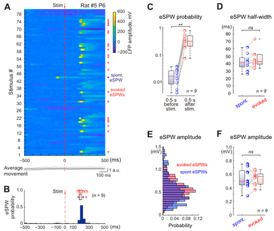 Somatosensory-evoked hippocampal eSPW response properties. (A), Stimulus-triggered raster plot of hippocampal local field potential (LFP) responses evoked by the first 80 stimuli in a P6 rat. The stimuli that evoked eSPW responses are marked by red asterisks (*) on the right, blue asterisk indicates a spontaneous eSPW. Below, corresponding movement trace averaged over three piezo-channels (black) with a 25–75% interquartile range (gray). Dashed red line shows the stimulus time (0 ms). (B), PSTH of all eSPW responses recorded from the rat shown in (A). A boxplot above the histogram shows group data on eSPW response peak time in nine P5-P6 rats. Circles—median peak time values in individual animals. Outliers are shown by red crosses. (C–F), Group data on probability (C), half-width (D) and amplitude (E,F) of spontaneous eSPWs and evoked eSPW responses in nine P5-P6 rats. Circles show corresponding median values from individual animals. **, p-value < 0.01; ns, not significant.