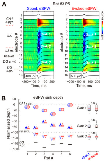 Current-source density (CSD) profile of spontaneous and stimulus-evoked eSPWs. (A), Average LFP traces recorded in P5 rat during spontaneous and stimulus-evoked eSPWs overlaid on corresponding CSD maps. Hippocampal layer borders are shown on the left (CA1 s.pyr.—str. pyramidale, s.r.—str. radiatum, s.l-m.—str. lacunosum-moleculare, DG s.ml.—str. moleculare, DG s.gr.—str. granulosum). (B), Group data on the location of three main current sinks (Sink 1—circles, Sink 2—triangles, Sink 3—inverted triangles) in CSD profiles of spontaneous (blue) and stimulus-evoked (red) eSPWs. Sink depths are normalized to CA1 s.pyr./s.r.–fissure distance. Boxplots on the right represent statistical data on sink depths. n.s.—not significant.