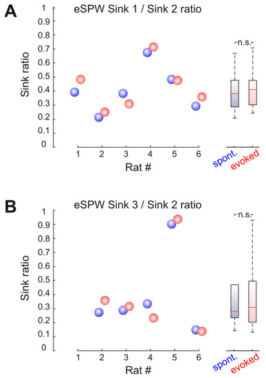 The relative magnitude of spontaneous and stimulus-evoked eSPWs. Group data on Sink 1/Sink 2 (A) and Sink 3/Sink 2 (B) amplitude ratio. Boxplots on the right show statistical data for spontaneous (blue) and somatosensory-evoked (red) eSPWs. Circles show median sink ratio values for spontaneous (blue) and stimulus-evoked (red) eSPWs in six individual P5–P6 rats. n.s.—not significant.