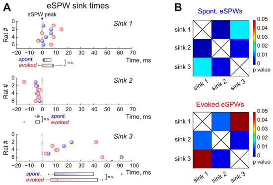 Time relations between three main current sink observed during spontaneous and stimulus-evoked eSPWs. (A), Group data on Sink 1, Sink 2 and Sink 3 times of spontaneous (blue circles) and stimulus-evoked (red circles) eSPWs in relation to eSPW peak (t = 0 ms). Corresponding boxplots are shown below each plot. n.s.—not significant. (B), p-value maps for current sink times of spontaneous (top) and stimulus-evoked (bottom) eSPWs.