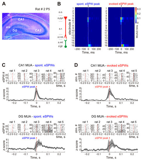 Multiple unit activity (MUA) recorded in CA1 pyramidal cell layer and DG granular cell layer during spontaneous and stimulus-evoked eSPW. (A), Post hoc reconstruction of 16 recording electrode locations across the hippocampal layers of a P5 rat. (B), MUA density plots for spontaneous eSPWs and stimulus-evoked eSPW responses. Recording site numbers correspond to those shown in panel A. Hippocampal layer borders are shown on the left—s.o., CA1 str. oriens; s.pyr., str. pyramidale; s.r., str. radiatum; s.l-m., str. lacunosum-moleculare; s.ml., DG str. moleculare; s.gr., DG str. granulosum. (C,D), Raster plots and average PETHs for MUA detected in CA1 s. pyr. (top) and DG s. gr. (bottom) during spontaneous eSPWs (C) and stimulus-evoked eSPW responses (D).