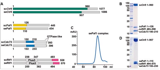Reconstitution and purification of the quaternary PAF1C from two kinds of yeast. (A). Domain architecture of PAF1Cs from Saccharomyces cerevisiae (sc) and Saccharomyces eubayanus (se). Segments of Ctr9, Paf1, Cdc73 and Rtf1 used in structural studies are colored in green, yellow, blue and magenta, respectively. (B). Coomassie blue staining of PAF1C from Saccharomyces cerevisiae. (C,D). A gel-filtration profile (C) and the subsequent Coomassie blue staining (D) of the quaternary PAF1C from Saccharomyces eubayanus.