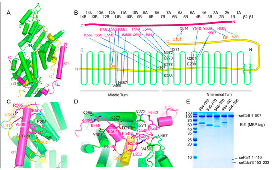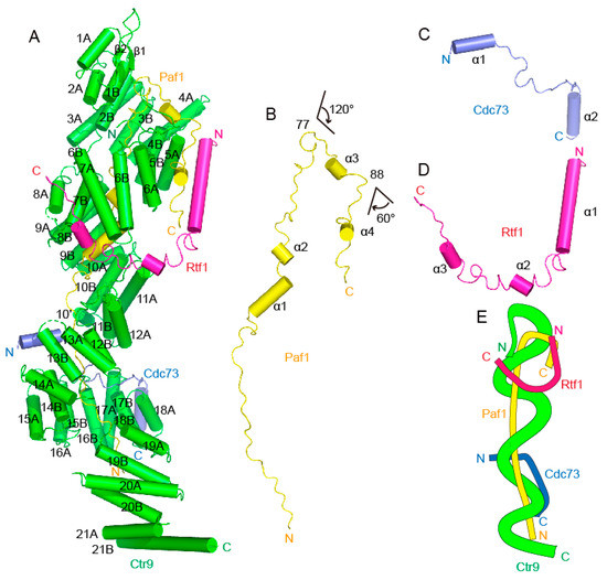 - Chen, F.; Liu, B.; Zeng, J.; Guo, L.; Ge, X.; Feng, W.; Li, D.F.; Zhou, H.; Long, J. Crystal Structure of the Core Module of the Yeast Paf1 Complex. J. Mol. Biol. 2022, 434, 167369. [Google Scholar] [CrossRef] [PubMed]