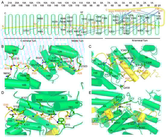 The overall architecture of the Ctr9-Paf1-Cdc73-Rtf1 quaternary complex from Saccharomyces eubayanus was shown to be similar as to those from the thermophilic fungus [24] and from humans [13] (Figure 2A). The largest component, Ctr9, forms the backbone and shapes the overall architecture of the complex, while the other components join the complex mainly through associations with Ctr9 (Figure 2A–D). Ctr9 folds into the shape of an elongated solenoid. The N-terminal region of Ctr9 contains two short β strands. The major body of Ctr9 folds into 21 tetratricopeptide repeats (TPRs) that wrap around the N-terminus of Paf1 to form a three-circled right-handed solenoid structure, with the Paf1 N-terminus just filling in the central tunnel of the Ctr9 solenoid. A typical TPR contains an A-helix and a B-helix connected by a loop. The TPR 10 of Ctr9 is atypical in that the loop connecting the two helices contains an additional short helix (labeled 10′) in the middle. Therefore, Ctr9 contains 43 helices in total. To facilitate crystallization, the C-terminal long α helix was truncated. As has been shown in the Ctr9 structures from other species, all TPRs of Ctr9 are organized into a two-layered wall-like structure, with the A-helices and the B-helices of the TPRs forming the outer layer and the inner layer of the solenoid surfaces (Figure 2A), respectively. Accompanying the spirally wound TPRs of Ctr9, a deep groove occurs between the edges of the spirally wound repeats (Figure 2A,E). The inner surface of Ctr9 interacts mainly with the N-terminus of Paf1, which is wrapped tightly inside the central tunnel of the Ctr9 solenoid and extends antiparallel to the direction that Ctr9 extends (Figure 2A,B). The rest of Paf1 extends out from the central tunnel and contacts the outer surface of Ctr9 (Figure 2A). Cdc73 and Rtf1 contact mainly the outer surface of Ctr9 (Figure 2C,D). Their interactions with Ctr9 were further strengthened by inserting a fragment into the groove of Ctr9 and making contacts with residues within the groove (Figure 2C,D).
