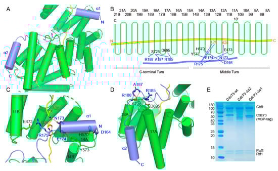 Cdc73 joins PAF1C mainly through its middle region, which contains two helices connected by loops, and contacts Ctr9 spanning a region containing the lower part of the middle turn and the upper part of the C-terminal turn (Figure 4A,B). The helix α1 of Cdc73 penetrates the groove of the Ctr9 solenoid from the edge between TPRs 13 and 14 (Figure 4C). This segment of Cdc73 almost floats on the edge of the TPRs. Hydrogen bonds can be observed between Asp164 of Cdc73 and His570 of Ctr9 and between Glu174 of Cdc73 and Tyr573 of Ctr9 (Figure 4B,C). At the C-terminal end of helix α1, Cdc73 reaches the inner-buried Paf1 (Figure 4D). As a result, Asn173 and Arg175 of Cdc73 form one and a pair of hydrogen bonds with Ala28 and Leu26 of Paf1, respectively (Figure 4B,D). Arg175 of Cdc73 also forms a salt bridge with Glu473 of Ctr9 (Figure 4B,D). From Arg175 to His180, Cdc73 extends alongside Paf1 within the groove of Ctr9, and then Cdc73 turns its direction and finds its path across the edge of TPRs to reach the outer surface of Ctr9 (Figure 4A,C). Reaching the outer surface of Ctr9, Cdc73 makes another turn to extend along the outer surface of Ctr9 between helices 17A and 18A (Figure 4A,D). Arg185, Ala187 and Arg188 are located at the turning point of Cdc73 and form several hydrogen bonds with Asp695 and Ser728 from Ctr9 to strengthen this interaction (Figure 4B,D). Threading out of the Ctr9 groove, Cdc73 mainly folds as helix α2 that extends in between and antiparallel to helices 17A and 18A (Figure 4D). The contacts at this region are also mainly mediated by hydrophobic interactions. To test the contribution of the structural elements of this region of Cdc73 to complex formation, we removed the N-terminal helix α1 or the C-terminal helix α2. Cdc73 without the α1 helix still formed a complex with the Ctr9-Paf1-Rtf1 ternary complex, while Cdc73 without α2 could no longer join the ternary complex (Figure 4E), indicating that the hydrophobic contacts by the C-terminal α2 are critical for Cdc73 to associate with Ctr9.