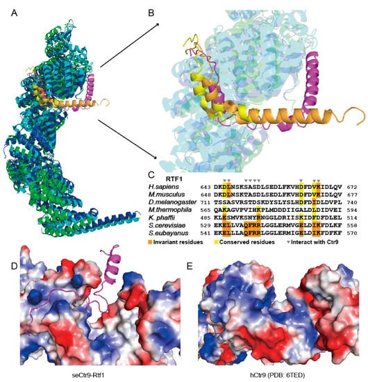 Sequence and structure analysis of the interacting residues and surfaces between Rtf1 and Ctr9. (A). Superimposition of the core structures of the Paf1 complex from Saccharomyces eubayanus (this study), Saccharomyces cerevisiae (PDB: 7DKH) and Komagataella phaffii (PDB: 7XN7). (B). A closeup view of the Rtf1-Ctr9 interacting regions in A. (C). Sequence alignment of the C-terminal regions of Rtf1 from different species. (D,E). Electrostatic representation of the Rtf1 binding surface on Ctr9 in Saccharomyces eubayanus (D), this study) and its corresponding surface in humans (E), PDB: 6TED).