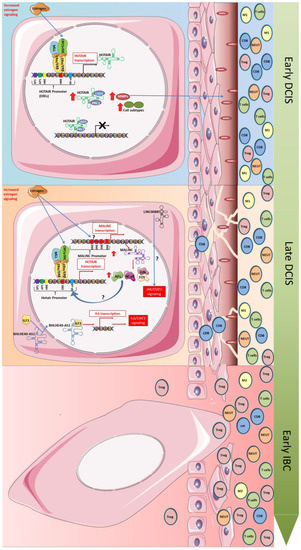 Studies have shown that estrogen regulation begins with the first changes that occur in transformed mammary cells. The increase in this signaling causes both ER alpha and ER beta to bind to the ER2 and ER3 sites in the HOTAIR promoter, activating its expression. In this activation, coregulators seem to be involved, and members of the MLL family are able to act in this function, as well as CBP/p300, forming the complex that binds to the ERE elements and activating gene transcription [98]. How other transcription factor-binding sites act during CDIS establishment and progression remains to be determined.