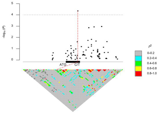 For association analysis of Zea mays candidate genes to identify ZmDRR206 variants related to HKW, we downloaded phenotypic data for 100-kernel weight of 513 diverse maize inbred lines [41] and the original genotypic data of 540 diverse maize inbred lines including approximately 2.65 million SNPs integrated from RNA-seq, 50 K array, 600 K and GBS technology [52] from MaizeGo (http://www.maizego.org/, accessed on 8 May 2022). These lines have tropical, subtropical, and temperate origins and hence represent the global diversity of maize germplasm. Genotyping data with minor allele frequency (MAF) below 0.05 were filtered then to implement genome-wide association analysis with a linear mixed model where the first three principal components and kinship matrix were used to control population structure and polygenic effect, respectively, in R package GAPIT (v3) [53]. 102 SNPs within the 5 kb upper distance from the start codon and the 5 kb down distance from the stop codon of the target gene ZmDRR206 were used to calculate the pairwise linkage disequilibrium in R package IntAssoPlot [54]. A Bonferroni-corrected significance threshold (p ≤ 0.01/102 = 9.803922 × 10−5, −log10 (p) = 4.00) was used to identify the significant casual SNPs within the gene ZmDRR206.