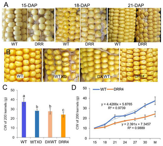 The dominant effect of ZmDRR206 on kernel development. (A): The phenotype of the developing maize kernels. The developing kernels of ZmDRR206 overexpressors were similar to WT at 15 days after pollination (DAP), while they appeared pale in color at 18 DAP and showed a dent or sunken appearance on the top of the kernel at 21 DAP. (B): The kernel phenotype of the test-cross and back-cross between ZmDRR206 overexpressor (DRR4) and WT. (C): The constant weight (CW) of 200 mature maize kernels. WT X D is to pollinate pollens from DRR4 plant on WT ear; D X WT is to pollinate pollens from WT plant on DRR4 ear. Different lowercase letters (a, b, c) above the bars indicate significant differences based on ANOVA analysis followed by multiple comparisons using the LSD test (p = 0.05). Error bars indicate the mean values ± SD of three replicates per genotype. (D): The development profile of the maize kernel by constant weight analysis of 200 kernels. WT is the wild-type inbred line LH244, DRR4 is ZmDRR206 overexpressing transgenic evert DRR-OE4. The numbers in x-axis are the days after pollination, M is the harvested mature kernel.