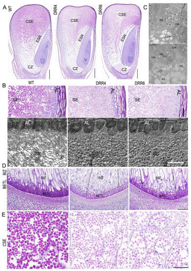 The cytological characterization of the developing maize kernel. (A): Comparison of the developing WT and the transgenic ZmDRR206 overexpressor (DRR-OE) kernels at 18 DAP by paraffin sectioning. The longitudinal sections at the middle part of the 18 DAP kernels were stained by periodic acid-schiff stain (PAS). CSE, the central starch endosperm; ESR, embryo surrounding region; CZ, the conducting zone. Bar = 1 mm. (B): Comparison of the developing aleurone layer (AL) and starch endosperm (SE) cells in the developing WT and DRR-OE kernels at 18 DAP. Upper: the PAS-stained section, bar = 100 μm; lower: the semi-thin section, bar = 50 μm. (C): The cellular characterization of the AL cells under TEM. AG, aleurone grain; SG, starch granule; CW, cell wall. Bar = 10 μm. (D): Comparison of the developing basal endosperm transfer layer (BETL) and the basal intermediate zone (BIZ) in DRR-OE and WT kernels at 18 DAP. The length of both the BETL (between the red dashed lines) and BIZ (between the dark dashed lines) cells were shorter and the wall ingrowths of flange BETL cells were much less in DRR-OE kernels than that in WT kernel. (E): The PAS-stained granules appeared paler in color in the CSE cells of DRR-OE kernels than that in WT kernels. WT is the wild-type inbred line LH244, DRR4 and DRR6 are ZmDRR206 overexpressing transgenic everts DRR-OE4 and DRR-OE6. Bar = 100 μm in (D,E).