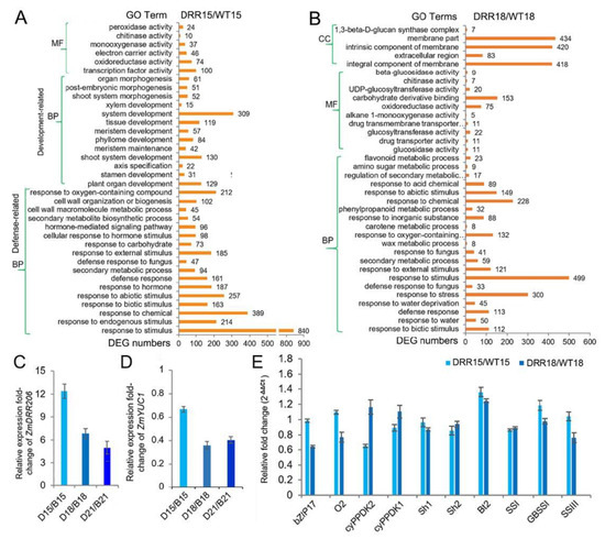 The transcriptome reprogramming induced by ZmDRR206 overexpression in developing DRR-OE kernels. (A,B): The GO enrichment analysis of the DEGs between DRR-OE and WT kernels at 15 DAP (A) and at 18 DAP (B). CC, cellular component; MF, molecular function; BP, biological process. The numbers beside the column of the diagram are the numbers of the DEGs enriched in the functional categories. WT15/WT18 is the kernel from the wild-type inbred line LH244 at 15 DAP/18 DAP, DRR15/DRR18 is the kernel from the ZmDRR206 overexpressors at 15 DAP/18 DAP. (C,D): The fold-change of the relative expression level of ZmDRR206 (C) or ZmYUC1 (D) between DRR-OE and WT kernels at 15, 18 and 21 DAP, respectively. B15/B18/B21 is the wild-type LH244 kernel at 15 /18 /21 DAP, respectively; D15/D18/D21 is the DRR-OE kernel at 15 /18 /21 DAP, respectively. (E): The fold-change of the relative expression level of kernel development or starch biosynthesis-related genes in the developing kernels of DRR-OE relative to WT by RT-qPCR. cyPPDK1/2, chloroplast pyruvate phosphate dikinase1/2; Sh1/2, shrunken1/2; Bt2, brittle-2; SSI, starch synthase I; GBSS1 (Waxy1), granule-bound starch synthase1; SSIII, starch synthase III. The rations of the expression level in DRR15/WT15 and DRR18/WT18 are detected in kernels from DRR-OE and WT at 15 DAP and 18 DAP, respectively. The statistical analysis in (C–E) was conducted using a paired Student’s t-test between WT and DRR at the indicated time point—15 DAP, 18 DAP or 21 DAP—in three replicates per genotype. DRR is DRR4 transgenic line. The significant differences are the absolute fold-change >2 under p < 0.05. That is the difference in expression level between WT and DRR of ZmDRR206 and ZmYUC1 was significant except ZmYUC1 at 15 DAP, while the transcriptional difference of other genes was not significant.