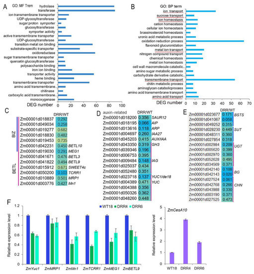 The expression of BETL development- and auxin signal-related genes was down-regulated by ZmDRR206 overexpression in developing DRR-OE kernels. (A,B): The most significant enriched molecular function (A) and biological process (B) GO terms of the down-regulated DEGs based on RNA-seq analysis of the BETL tissue of DRR-OE and WT kernel at 18 DAP. The most important functional categories were underlined in red. (C–E): Heatmap showing changes in the expression levels of BETL development-related (C), auxin signal-related (D) and cell transportation and wall modification-related (E) genes in BETL tissue of DRR-OE and WT kernel. AIP, auxin-induced protein; ARP, auxin responsive protein; GH3, indole-3-acetic acid-amido synthetase; IAG, indole-3-acetate beta-glucosyltransferase; YUC, flavin monooxygenase; BETL, basal endosperm transfer layer; BIZ, basal intermediate zone. BSTS, bidirectional sugar transporter sweet13/14; SUT, sucrose transporter; UGT, UDP-glycosyltransferase; BG, beta-glucanase; CHN, chitinase. WT is the BETL tissue from wild-type LH244 kernel, DRR is the BETL tissue from DRR-OE kernel. The numerical values are the ratios of the DEGs in the comparison (DRR/WT), the background color showed the relative gene expression levels in the comparison (red represents up-regulated, blue is down-regulated, and yellow is no significant change). (F): The relative expression level of BETL-development-related genes in developing BETL of DRR-OE relative to that of WT kernel by RT-qPCR. WT18 is the BETL from the kernel of wild-type LH244 at 18 DAP, DRR4 and DRR6 are the BETL from the DRR-OE kernel at 18 DAP of the ZmDRR206 overexpressing transgenic everts DRR-OE4 and DRR-OE6. The statistical analysis was conducted using a paired Student’s t-test (between WT and DRR4 or DRR6) in three replicates per genotype. The significant differences are the absolute fold-change >2 under p < 0.05. That is, the transcriptional difference of most genes was not significant, except the transcriptional difference of ZmMn1, ZmTCRR1 and ZmCesA10 in WT and DRR4 was significant.