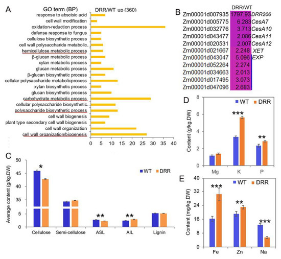 The cell wall organization/biogenesis-related functions were up-regulated in developing BETL of DRR-OE kernel. (A): The most significantly enriched biological process of the up-regulated DEGs from RNA-seq analysis of the BETL tissue of DRR-OE and WT kernel at 18 DAP. The most important functional categories were underlined in red. (B): Heatmap showing the fold-changes in expression levels of the cell wall biogenesis-related genes in BETL of DRR-OE relative to WT kernel at 18 DAP. CesAs were genes encoding cellulose synthase, XET encodes xyloglucan endotransglucosylase hydrolase; EXPs encode expansins. WT is the BETL from wild-type LH244 kernel, DRR is the BETL from DRR-OE kernel. The numerical values are the ratios of the DEGs in the comparison (DRR/WT), the background color showed the relative gene expression levels in the comparison (red represents up-regulated, blue is down-regulated, and yellow is no significant change). (C): The contents of the main cell wall components in the developing maize kernel at 18 DAP. ASL, acid soluble lignin; AIL, acid insoluble lignin; lignin is the summary of ASL and AIL. (D,E): The contents of the mineral elements in the air-dried mature maize kernels measured according to equal biomass. DW is dry weight. Data are presented as the mean values ± SD of three replicates per genotype. The asterisks represent a significant difference at * p < 0.05, ** p < 0.01, and *** p <0.001, according to a paired Student’s t-test.