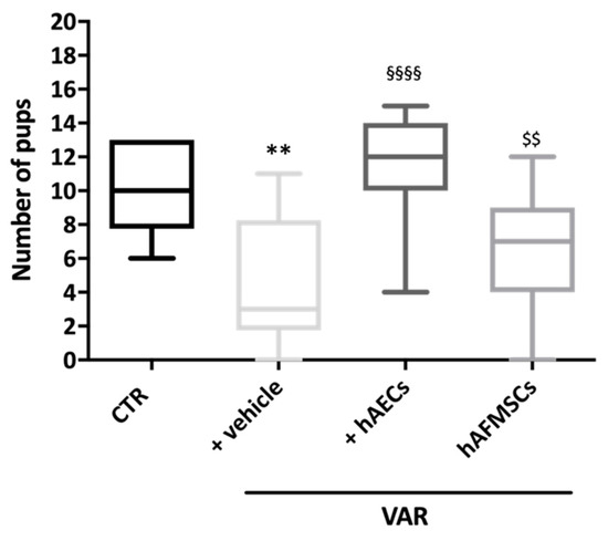 2.1. Influence of VAR Treatment with hAECs and hAFMSCs on Rat Fertility Rate