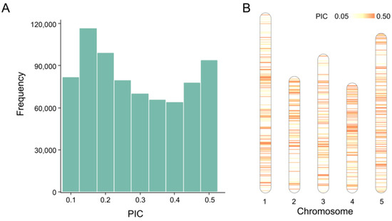 The PIC value of cSNPs in Train_Data and the DT-PICS-selected SNP distribution on chromosomes. (A) The histogram of PIC values of cSNPs in Train_Data; (B) The chromosome distribution of 769 SNPs screened out with DT-PICS.