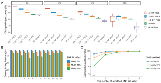 Table 1 shows a comparison of identification simulation analyses of the 11th SNP set. The order of average distinguishing accuracy of the three methods was DT-PICS (93.54%) > HPS (82.92%) > RS (78.32%). The distinguishing accuracy using the 11th SNP set was 96.74%, 92.78%, and 84.64% at 5%, 10%, and 15% SNP modification levels, respectively. The mean distinguishing accuracy of the SNP set was 91.39% with a standard deviation of 0.062.