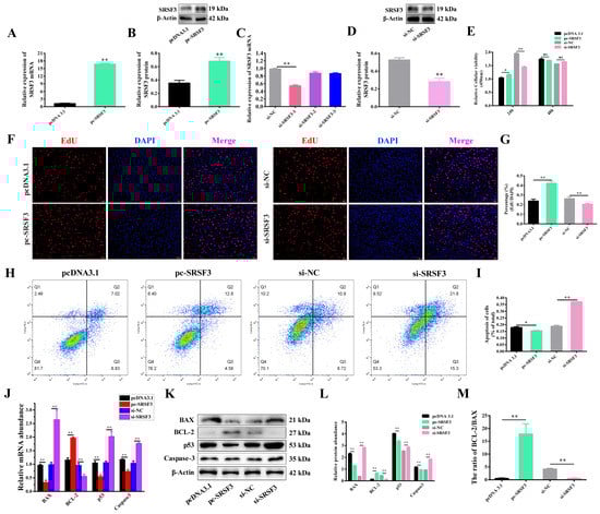 SRSF3 was highly expressed in the granulosa cells (GCs) of small follicles. However, as the follicle matured, there was a notable decline in SRSF3 expression within the GCs of larger follicles (Figure S2). To further illustrate the role of SRSF3 in GC proliferation and apoptosis in small follicles, we constructed an overexpression plasmid vector (pc-SRSF3) and synthesized interfering RNAs (siRNAs) to overexpress and silence the expression of SRSF3 in the GCs of small follicles. The results demonstrated that the overexpression of SRSF3 resulted in a significant increase in SRSF3 mRNA and protein expression in the GCs compared with the control (Figure 3A,B). Additionally, si-SRSF3 (si-SRSF3-1, the most efficient of the three interfering RNAs, referred to as si-SRSF3) significantly inhibited SRSF3 mRNA and protein expression in the primary GCs (Figure 3C,D). After the GCs were treated with pc-SRSF3 for 24 h, cell viability was remarkably improved. In contrast, compared with si-NC, si-SRSF3 observably restrained the viability of the GCs. However, no distinct difference was observed between pc-SRSF3 and pcDNA 3.1 treatments for 24 h and 48 h (Figure 3E). Consistently, the EdU assay results showed a significant improvement in cell proliferation after 24 h of pc-SRSF3 transfection, while the proliferation rate declined significantly after transfection with si-SRSF3 for 24 h, indicating functional regulation through which SRSF3 promoted GC vitality and proliferation (Figure 3F,G). Then, Annexin V and propidium iodide (PI) staining, along with flow cytometry analysis, showed that accumulated SRSF3 expression markedly reduced the late apoptosis rate (Q2) of the primary GCs (Figure 3H,I). As expected, SRSF3 negatively regulated BAX, p53 and Caspase-3 mRNA and protein levels, but increased BCL-2 expression and the ratio of the BCL-2/BAX protein expression (Figure 3J–M), suggesting that SRSF3 enhanced GC viability and proliferation while inhibiting GC apoptosis.