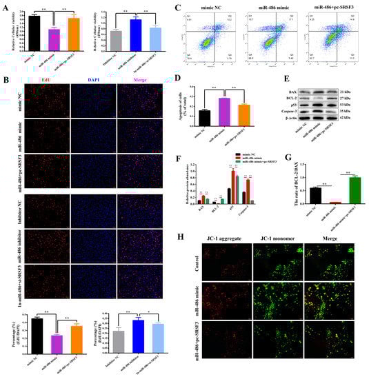 To further investigate whether SRSF3 is the downstream molecular regulatory factor of miR-486, the miR-486 mimic and pc-SRSF3 were co-transfected into the GCs, as well as the miR-486 inhibitor and si-SRSF3. As detected by the CCK-8 and EdU assay, co-transfection of the miR-486 mimic and pc-SRSF3 rescued the suppressive effect of miR-486 on GC proliferation and vitality. Co-transfection of the miR-486 inhibitor and si-SRSF3 weakened the positive effects of the miR-486 inhibitor on the viability and proliferation of the GCs (Figure 4A,B). Co-transfection of the miR-486 mimic and pc-SRSF3 attenuated the effect of miR-486 on the promotion of GC apoptosis, as determined by flow cytometry (Figure 4C,D). In addition, the BAX, p53 and Caspase-3 protein levels were reduced in cells co-transfected with the miR-486 mimic and pc-SRSF3 compared with cells treated with the miR-486 mimic alone, while the protein level of BCL-2 and the ratio of BCL-2/BAX protein expression were restored after co-transfection (Figure 4E,F,G). Furthermore, co-transfection of the miR-486 mimic and pc-SRSF3 decreased the mitochondrial membrane potential (MMP), indicating that the GCs were in the early stage of mitochondrial injury, as detected by the JC-1 probe. These results implied that the involvement of SRSF3 was able to reduce the effect of miR-486 on GC apoptosis and strengthen GC proliferation (Figure 4H).