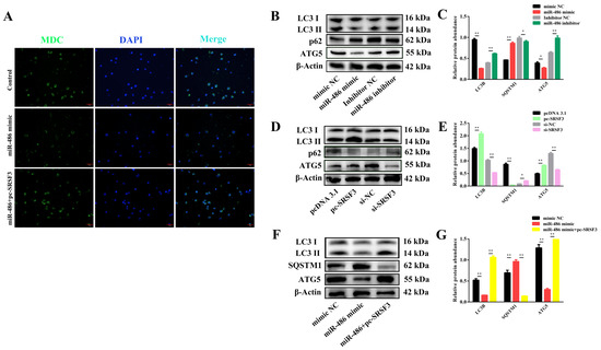 miR-486 regulated granulosa cell (GC) autophagy via SRSF3. (A) The autophagic vacuoles of the GCs were labeled in green using MDC staining. The nuclei of the GCs were stained blue with DAPI (scale bar, 50 μm). (B,C) After transfection with miR-486 for 24 h, the protein expression of LC3II, SQSTM1 and ATG5 was analyzed by Western blotting. (D,E) After transfection with SRSF3, the protein expression of LC3II, SQSTM1 and ATG5 was analyzed. (F,G) After co-transfection with the miR-486 mimic and pc-SRSF3, the protein expression of LC3II, SQSTM1 and ATG5 was analyzed. Error bars represent the mean ± SEM; the mean values were considered different: * = p < 0.05; ** = p < 0.01.