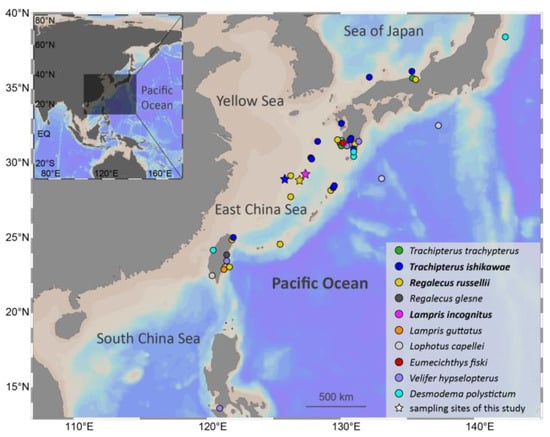 Specimens of three lampriform species were collected from three sites throughout the East China Sea between 2018 and 2021 via bottom trawling carried out by local fishermen. Muscle samples were dissected from the dorsal part of each specimen, which were then separately stored at −80 °C. We amplified the mitochondrial COI gene to identify each species. A TIANamp Marine Animals DNA Kit (TIANGEN, Guangzhou, China) was used to extract DNA from muscle samples. The mitochondrial COI gene was amplified by polymerase chain reaction (PCR) using the following primers: FishF-COI 5′ TCG ACT AAT CAT AAA GAT ATC GGC AC 3′ and FishR-COI 5′ TAG ACT TCT GGG TGG CCA AAG AAT CA 3′.