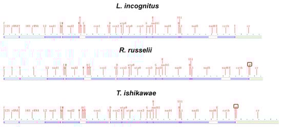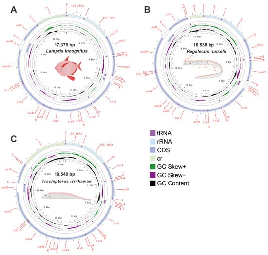 Mitochondrial genomic organization is highly conserved among vertebrates and usually consists of 13 PCGs, 22 tRNAs, 2 rRNAs, and 1 non-coding control region arranged in a specific order. We compared the mitochondrial genome structure of three newly sequenced lampriform species (Figure 4; Supplementary Table S2).
