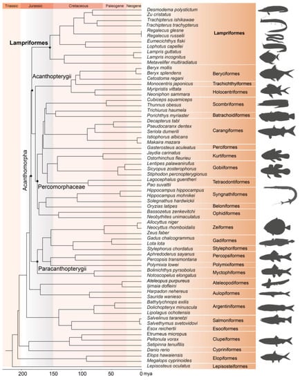 - Near, T.J.; Eytan, R.I.; Dornburg, A.; Kuhn, K.L.; Moore, J.A.; Davis, M.P.; Wainwright, P.C.; Friedman, M.; Smith, W.L. Resolution of ray-finned fish phylogeny and timing of diversification. Proc. Natl. Acad. Sci. USA 2012, 109, 13698–13703. [Google Scholar] [CrossRef]