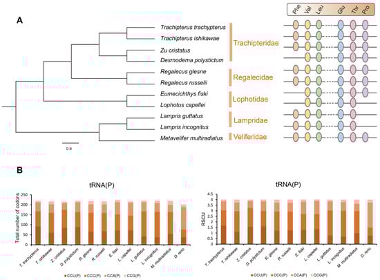 The tRNA loss in L. incognitus. (A) Phylogeny and tRNA loss of Lampriformes. (B) RSCU of the mitogenomes of Lampriformes.