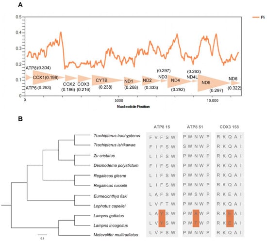 Nucleotide diversities and selection pressures of 13 PCGs in Lampriformes. (A) A sliding window analysis of protein-coding genes of Lampriformes. The orange curve shows the value of nucleotide diversity (Pi). Pi value of each PCG was shown in parentheses. (B) Analysis of the selection pressure of Lampriformes with the opah as the foreground branch.