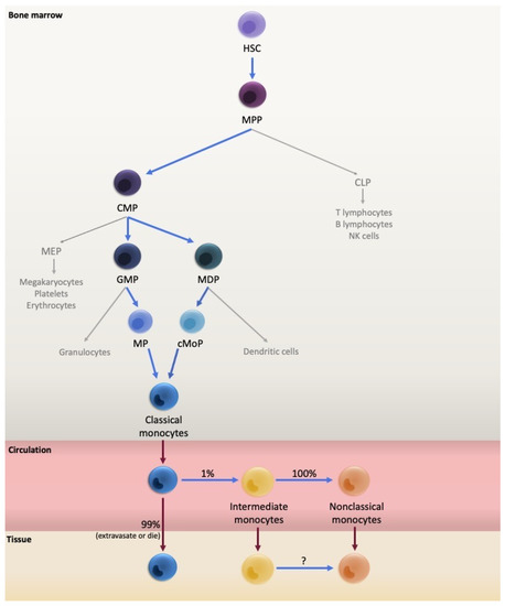Like most blood cells, monocyte ontogeny originates from HSPC predominantly in the bone marrow. Haematopoietic stem cells (HSC) are pluripotent cells with a self-renewing capacity that is lost upon differentiation into multipotent progenitors (MPP), which in turn reduce their multipotency as they differentiate through a hierarchy of increasingly lineage-committed progenitors [15]. The traditional model describes MPP progeny as being divided into common myeloid progenitors (CMP) or common lymphoid progenitors (CLP) [16,17], monocytes being of the myeloid lineage. CMP then differentiate further into granulocyte-macrophage progenitors (GMP) which give rise to monocytes and granulocytes, or into megakaryocyte-erythroid progenitors (MEP) giving rise to erythrocytes, platelets, and megakaryocytes [16,17] (Figure 1).