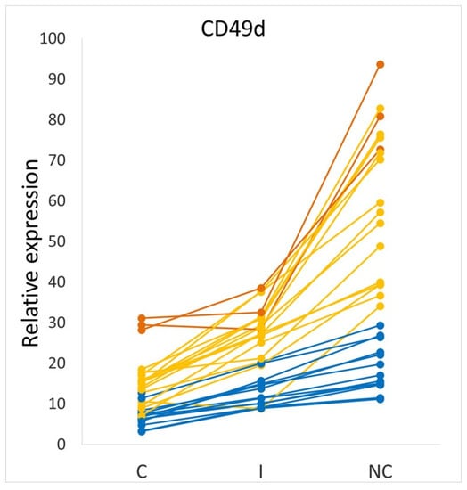Variation in CD49d between monocyte subsets for different study individuals. Each line on the graph is representative of the relative CD49d marker expression for one individual. Dark orange lines show study subjects with higher expression of CD49d on all three monocyte subsets than the nonclassical subset of the participants indicated by the blue lines. The remainder of the participants’ data is shown in yellow. C: Classical; I: intermediate and NC: nonclassical. The figure is adapted with permission from Patel et al. ‘Monocyte subset recruitment marker profile is inversely associated with blood ApoA1 levels’, Frontiers in Immunology 2021 [14]. Copyright 2021 Patel, Williams, Li, Fletcher, and Medbury.