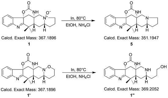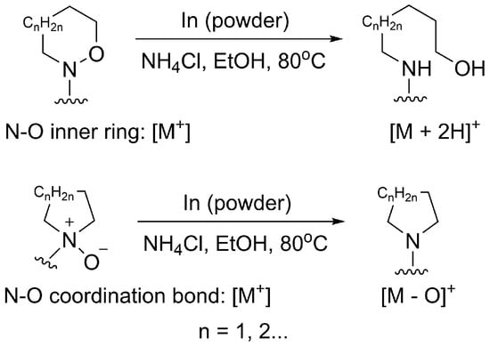 In this study, we used a simple and accurate method to determine the structure of N-oxides. Indium powder was used as a mild reductant under weakly acidic conditions to break the N-O bond []. As shown in Figure 1, different products with different molecular weights will be obtained using this method. Compounds with N-O inner rings will undergo indium-mediated reduction reactions that break the N-O rings and add two hydrogens to the compounds [,]. Therefore, we can obtain the M + 2H reaction product and find the corresponding molecule ion peaks from the HR-MS data. As for N-oxides, via the subsequent In-mediated reduction with the lost oxygen molecule weight observed in HR-MS data, the N-O coordination bonds can be recognized directly.