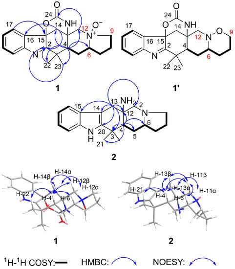 The 2D NMR spectra were important to confirm the structure of 1. From the 1H-1H COSY spectrum correlations of H-17/H-18/H-19/H-20 and H-4/H-5/H-6/H-7/H-8/H-9, two partial structure units could be established. The HMBC spectrum showed the connections of these substructures between H-17/C-15; H-14/C-2, C-16; H-22/C-2; H-23/C-2; H-12/C-24; H-4/C-3, C-6, C-12, C-13, C-14, C-22, C-23 (Figure 3). From HR-ESI-MS data, we found 1 had an m/z that was 16 higher than 5. So, we believed 1 had one oxygen atom more than 5. Comparing the 13C NMR of 1 and 5, we found the chemical shifts at C-6 (δC 75.9), C-9 (δC 69.0) and C-12 (δC 68.9) of 1 were quite different from C-6 (δC 65.6), C-9 (δC 54.2) and C-11 (δC 62.9) of 5. So, a N-O bond must exist at N-11. Additionally, the exact structure of N-O bond could not be confirmed by the weak correlation signal between H-12α/C-9. Meanwhile, from the (+)-HR-ESI-MS/MS data of compound 1 and 5 (Figures S40 and S41), we found 1 and 5 may have similar MS fragmentation patterns (Schemes S1 and S2), and there is no fragment of [M-16] in MS/MS data of 1. So, there were two different possible structures: N-oxide (1 in Figure 3) and a compound containing an N-O bond six-ring system (1′ in Figure 3).