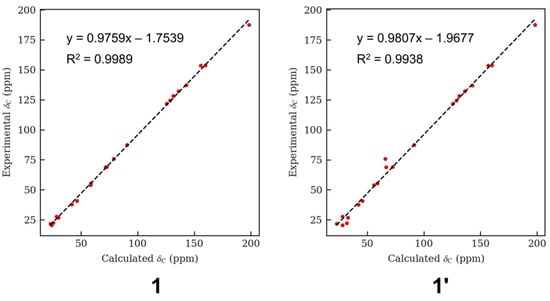 Regression analysis of experimental versus calculated 13C NMR chemical shifts of 1 and 1′.