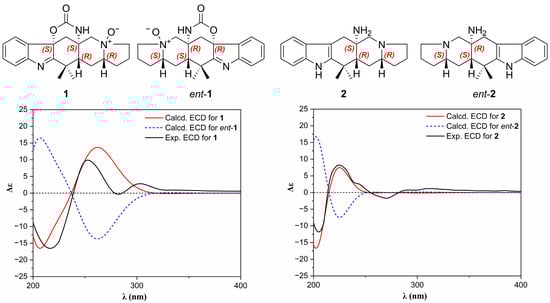 Experimental and calculated ECD spectra of 1 and 2 in methanol.