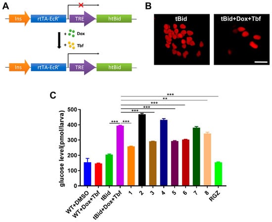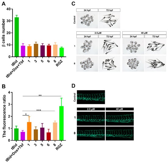 To survey the hypoglycemic activities of these compounds, a zebrafish β-cell ablation model, Tg(−1.2ins:htBidTE-ON; LR), was applied []. The truncated human Bid protein (htBid) was derived by an insulin promoter and controlled under the tetracycline- and ecdysone-inducible system (Figure 6A). After induction with doxycycline (Dox) and tebufenozide (Tbf), the proapoptotic tBid expression in β cells resulted in the apoptosis of β cells, which were labeled by the transgenic line Tg(−1.2ins:H2Bmcherry) (Figure 6B). We then processed the model for a bioactive test via co-incubation with these eight compounds (10 μM) for 24 h. As shown in Figure 6C, the free glucose level was significantly increased after the β cells’ ablation compared with the non-induced transgenic zebrafish (tBid + Dox + Tbf vs. tBid, 394 ± 2.9 pmol/larva vs. 204 ± 3.9 pmol/larva, p < 0.001), suggesting that the β cells’ ablation caused zebrafish hyperglycemia. Interestingly, the glucose levels of hyperglycemia zebrafish treated with compounds 1, 3, 5, 6 and 8 were 258 ± 2.2 pmol/larva, 291± 2.3 pmol/larva, 294 ± 2.1 pmol/larva, 303 ± 2.0 pmol/larva and 342.5 ± 8.7 pmol/larva, respectively, which significantly reduced the glucose levels (vs. tBid+Dox+Tbf, 394 ± 2.9 pmol/larva, p < 0.001 or p < 0.01), which revealed that these compounds have hypoglycemic activities. Moreover, the glucose level in the compound 1 group was lower than 5 (258 ± 2.2 pmol/larva vs. 294 ± 2.1 pmol/larva), which indicated that 1 had higher hypoglycemic activity than 5.