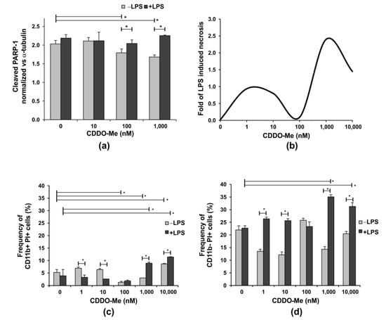 The effect of CDDO-Me on the apoptosis of bone-marrow-derived neutrophils. BM neutrophils were stimulated with 100 ng/mL LPS in the presence of increasing concentrations of CDDO-Me for 18 h. (a) PARP-1 cleavage was used as a surrogate marker for caspase activation and apoptosis. The level of cleaved PARP-1 was evaluated by the colorimetric Pierce™ Cleaved PARP In-Cell kit (#62219; Thermo Fisher Scientific, Waltham, MA, USA) and was normalized to the level of α-tubulin according to the manufacturer’s protocol. Data represent the mean ± SD of two independent experiments, involving three mice/experiment; samples run in triplicate (n = 6/group), * significant p values between the groups, using the ANOVA test. (b) Fold of LPS-induced necrosis in one representative experiment evaluated using propidium iodide (PI) staining using flow cytometry (BSR II flow cytometer) with BD FACSDiva v6.1.2 Software (Becton Dickinson GmbH, San Jose, CA, USA). Neutrophils were cultured as described in (a) for 24 h. Flow cytometry analyses showing the effect of increasing CDDO-Me concentrations on the frequency of (c) CD11b+ PI+ and (d) CD11b− PI+ cells cultured as described (a) for 24 h. PI staining was performed at the end of culture period and after cell incubation with the APC-labelled antibody against CD11b. Flow cytometry data were obtained using a BSR II flow cytometer with BD FACSDiva v6.1.2 Software (Becton Dickinson GmbH, San Jose, CA, USA) and analyzed using Cyflogic software 1.2.1 (CyFlo Ltd., Turku, Finland). The data represent mean ± SD of two independent experiments, involving three mice/experiment; and samples run in duplicate (n = 6/group), * significant p values between the groups, using the ANOVA test.
