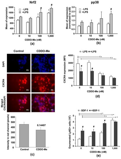 CDDO-Me increases Nrf2 levels in LPS-stimulated BM-derived Ly6G+ neutrophils, and down regulates CXCR4 expression affecting chemotaxis to SDF-1 and LPS-mediated phosphorylation of p38 MAPK. Purified BM neutrophils were stimulated with 100 ng/mL LPS (#2637, strain O5:B5, Sigma-Aldrich, Munich, Germany) in the presence of increasing concentrations of CDDO-Me for 6 h. The protein levels of Nrf2 (a) and of phosphorylated/non-phosphorylated p38 MAPK (b), respectively, were measured by flow cytometry using PE-labelled antibody against pT180/pY182, pp38 (clone 4NIT4KK, #612565, eBiosciences, Hatfield, UK), purified antibody against total protein p38 (clone Poly6224; #622403, BioLegend, London, UK), and FITC-labelled anti-rabbit antibody (1:500 diluted; #406403; BioLegend, London, UK). The data were obtained by BD FACSDiva v6.1.2 Software (Becton Dickinson GmbH, San Jose, CA, USA) and analyzed by Flowing Software 2.2 (Cell Imaging Core, Turku Centre for Bio-technology, Turku, Finland). The mean value of phosphorylated p38 MAPK (pp38) protein (n = 6/group) was normalized to the mean value of the total p38 MAPK protein (n = 6/group). The data represent the mean ± SD of two experiments run in triplicate (n = 6/group), # significant p values between LPS-stimulated groups (+LPS), * significant p values between unstimulated (−LPS) groups, using the ANOVA test. (c) Immunofluorescence showing CXCR4 expression on BM neutrophils after 6-h culture in the absence of presence of 1000 nM CDDO-Me. Fluorescence Leica DM6 microscope with DFC7000 T camera and the LAS × 5.0.2 software (Leica Microsystems; RSR Ltd., Sofia, Bulgaria) were used at magnification 60× to capture images from 5 different fields of each sample. Image analysis was performed by Image J software (National Institutes of Health, University of Wisconsin) and expressed as fluorescence intensity in the red channel. Graph shows mean ± SD of the data (n = 15/group), * number denotes p value between the groups, using Student t-test. (d,e) Purified BM neutrophils were activated with 100 ng/mL LPS in the presence of increasing concentrations of CDDO-Me for 6 h. Surface CXCR4 expression shown as mean fluorescence intensity (MFI) was assessed by flow cytometry using APC-labelled CXCR4 (clone L276F12, #146507, BioLegend, London, UK). (d). Data represent a mean ± SD of four experiments, including three mice, samples run in triplicate (n = 12/group). # significant p values between unstimulated (−LPS) and LPS-stimulated cells (+LPS), * significant p values between CDDO-Me-treated and untreated groups, using the ANOVA test. (e) Effect of CDDO-Me on cell chemotaxis towards SDF-1. BM-derived neutrophils (2 × 106 cells/mL) were pre-treated with increasing concentrations of CDDO-Me for 1 h. The cells were washed, added to an insert, and allowed to migrate for 6 h towards a medium containing 10 ng/mL murine recombinant SDF-1 (#250-20B; PeproTech, Cambridge, UK). The migrated cells were enumerated by counting beads using BD FACSDiva v6.1.2 Software (Becton Dickinson GmbH, San Jose, CA, USA). The data represent the mean ± SD of two experiments, including three mice/experiment, samples (n = 6/group) run in triplicate. # significant p values between −SDF-1 and +SDF-1 groups, using the ANOVA test. * significant p values between CDDO-Me-treated and untreated groups, using the ANOVA test.