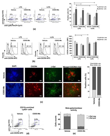 We observed that Ly6G+CD11b+ cells were more resistant to necrosis than Ly6G+CD11b− cells in late cultures, and CDDO-Me at concentrations between 100 and 1000 nM significantly affected the survival of the CD11b+ population (Figure 1). We next purified BM-derived Ly6G+ cells and enriched the population to ~80% CD11b+ cells via magnetic sorting (Supplemented Figure S3a). Neutrophils were then stimulated or not with LPS (100 ng/mL) in the presence of the vehicle (DMSO) or 1000 nM CDDO-Me. In order to identify the senescence phenotype, the cells were collected after 6 h and the intracellular level of β-galactosidase (β-Gal) (Figure 3a–d), β-Gal enzyme activity (Figure 3e), and the surface CXCR4 were assessed (Figure 3b–d). The percentage of unstimulated Ly6G+Gal+ neutrophils (CD11b enriched) decreased by two times in CDDO-Me-treated in comparison with the vehicle-treated cultures (Figure 3a). The frequency of Ly6G+Gal+ cells was modestly enhanced by LPS stimulation (Figure 3a) and maintained with CDDO-Me (1000 nM; Figure 3a). In fact, when we studied the density of the surface CXCR4, defined as an indicator of neutrophil senescence, we noticed that vehicle-treated Ly6G+Gal+ cells had a higher chemokine receptor expression than CDDO-Me-treated Ly6G+Gal+ cells (Figure 3b). We then conducted immunofluorescence analyses to identify CXCR4+ cells that express β-galactosidase. Vehicle-treated Ly6G+CD11b+ cells showed co-staining for CXCR4 and β-Gal more frequently than CDDO-Me-treated cells. The numbers of Gal+CXCR4+ cells were three times higher in the vehicle group than in the CDDO-Me-treated group (Figure 3c). According to additional flow cytometry data, CDDO-Me reduced senescent Ly6G+CD11b+CXCR4+Gal+ frequency by around 1.8 times (Figure 3e). We next studied the activity of β-Gal in a 6 h culture of CDDO-Me treated or untreated CD11b-enriched Ly6G+ cells (Figure 3e). Neutrophils positive for the enzyme activity were identified by the color response in blue after the addition of a substrate solution (Supplemented Figure S3b). Blue cells were counted in the captured photographs using an Image J software plug in. Beta-Gal activity was detected in 83% of cells cultured in the presence of the vehicle and in ~17% of neutrophils cultured in the presence of CDDO-Me (Figure 3e). Altogether, the data showed that CDDO-Me inhibited the senescence phenotype of Ly6G+CD11b+ neutrophils.