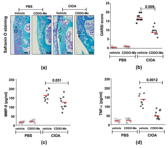 We next studied the in vivo effect of CDDO-Me in mice with CIOA. The compound was injected intra-articularly in anesthetized Balb/c mice, twice a week starting at day 7 post-CIOA (50 µg/knee). At day 14, knee joints were collected and used for histology or synovial tissue extract preparation. We observed a significantly decreased OARSI score for knee-joint damage in the CDDO-Me group in comparison with the vehicle-treated CIOA mice (Figure 4a,b). The disease improvement was accompanied by the inhibition of locally produced degradation enzyme MMP-9 (Figure 4c) and especially the pro-inflammatory cytokine TNF-α (Figure 4d).