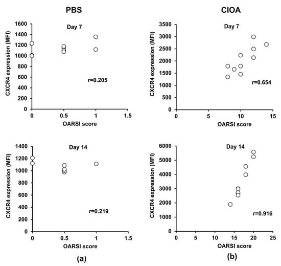 Correlation between disease activity and CXCR4 expression on BM-derived Ly6G+ neutrophil cells. (a) Pearson’s correlation between OARSI score and CXCR4 expression in PBS control group at day 7 (n = 10/group from two separate experiments) and day 14 (n = 10/group from two separate experiments). (b) Pearson’s correlation between disease activity and CXCR4 expression in the CIOA group at day 7 and day 14. The coefficient was calculated using plug-in Real Statistic and the null hypothesis was accepted or rejected when α = 0.05 at degree of freedom 16.
