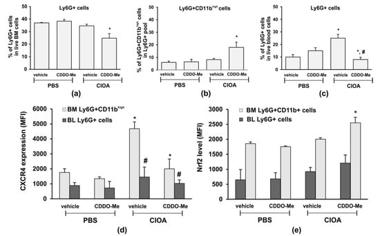 As we observed that disease activity in CIOA mice was correlated with the senescent phenotype in CD11bhigh BM-derived neutrophils (Figure 5), we next delineated the effect of CDDO-Me on the number and frequency of Ly6G+ cells in blood- and BM-derived neutrophils from CIOA mice. Treatment with CDDO-Me decreased the frequency of Ly6G+ cells in BM (Figure 6a). However, we found an elevated frequency of mature neutrophils (Ly6G+/CD11bhigh) within the BM pool (Figure 6b). In blood, CDDO-Me significantly reduced the number of circulating neutrophils (Figure 6c) and inhibited the senescent neutrophil phenotype as assessed by the CXCR4 expression (Figure 6d). We hypothesized that CDDO-Me may stimulate the homing of senescent neutrophils from the blood to the bone marrow. We next investigated whether or not the local application of CDDO-Me affected the Nrf2 level in mature neutrophils from the bone marrow (Figure 6e). Neutrophils were isolated from the CIOA tibia, which was affected by the localized pathological process (Figure 4a—chondrocyte apoptosis). We observed that CDDO-Me was able to significantly increase the Nrf2 levels in mature BM-derived neutrophils from CIOA mice. Blood neutrophils were less responsive to the effect of CDDO-Me and showed only slightly elevated Nrf2 (Figure 6e).